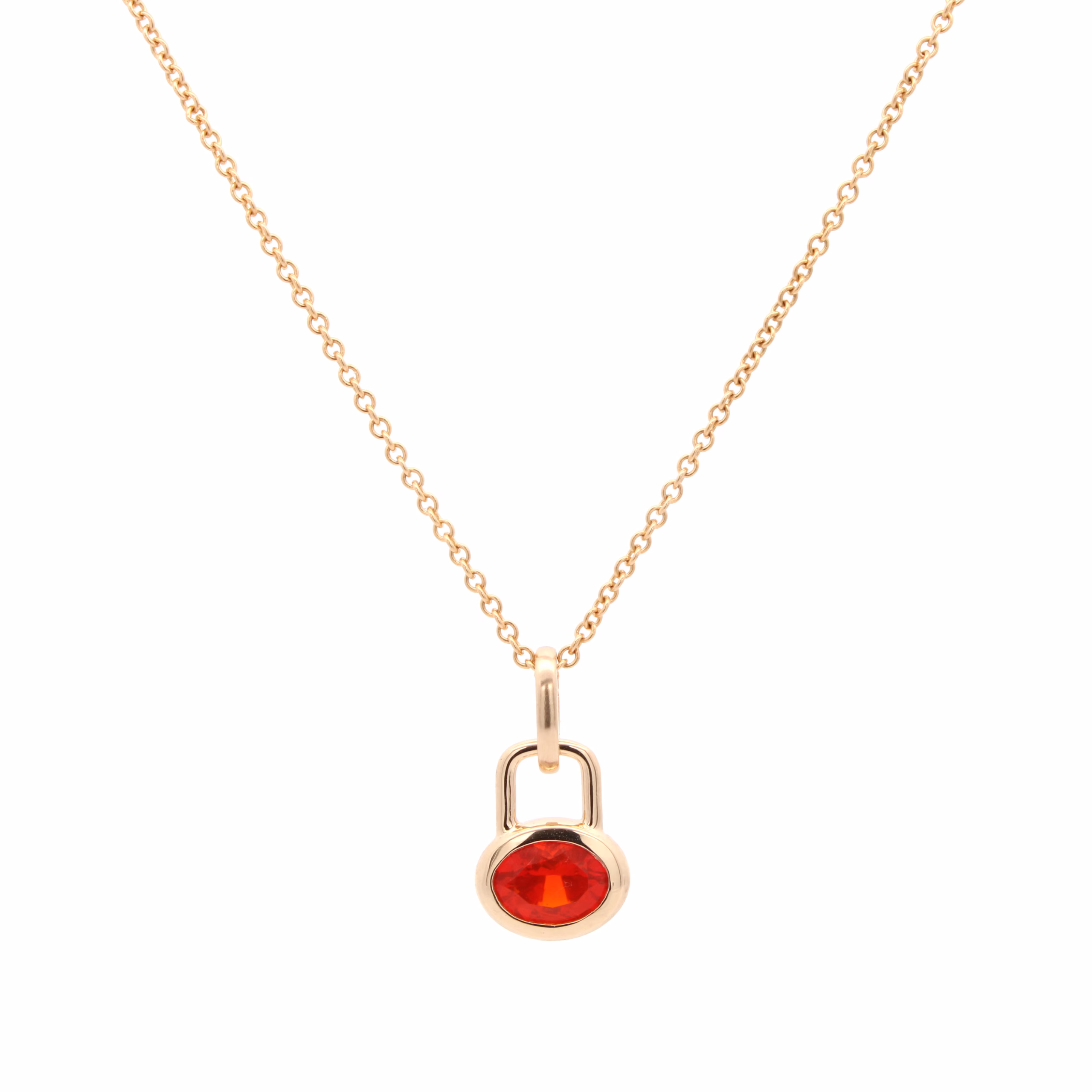 A symbol of love and commitment– to oneself or another– this 14k yellow gold padlock shaped pendant features a 0.85ct oval Mexican fire opal. It is reversable and can be worn in multiple ways. Charm bail and 18″ 14ky chain both optional.