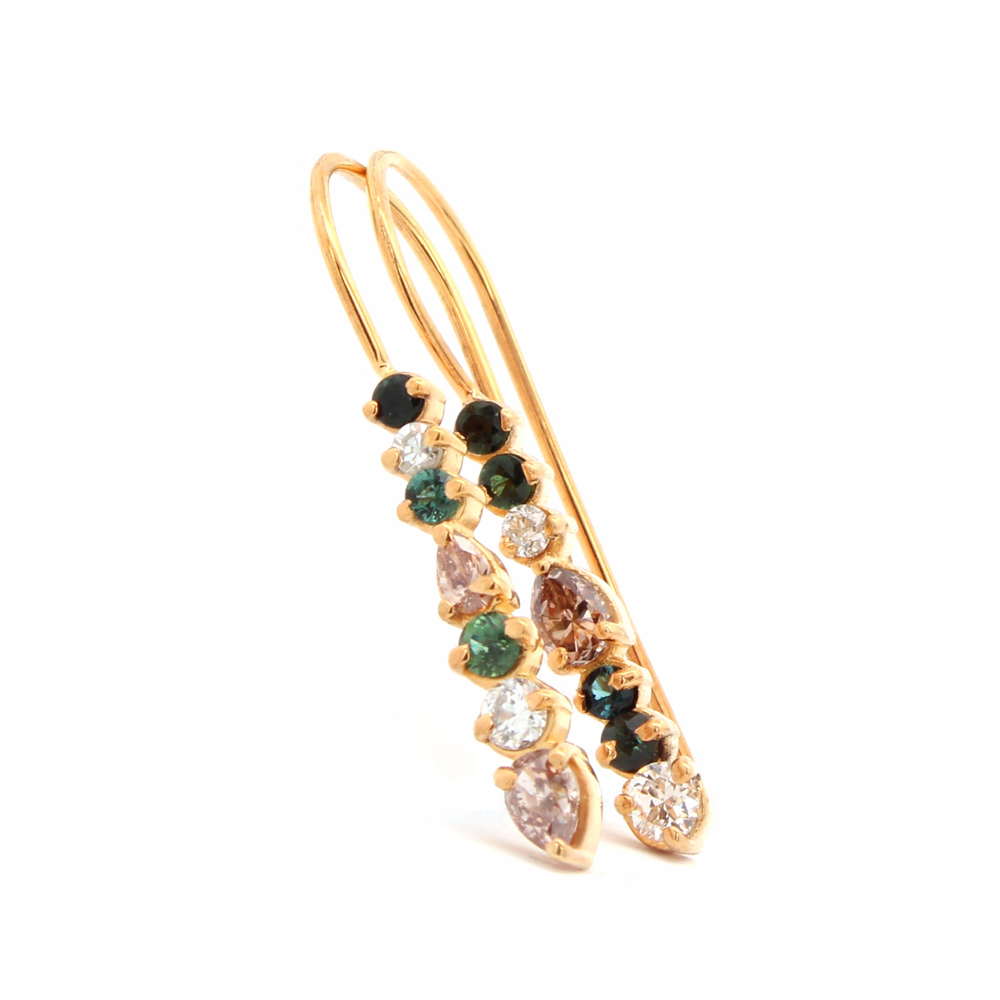 These asymmetrical earrings feature green tourmaline, white diamonds and fancy brown diamonds. They are made of 14k yellow gold and measure 1.25″ in length.