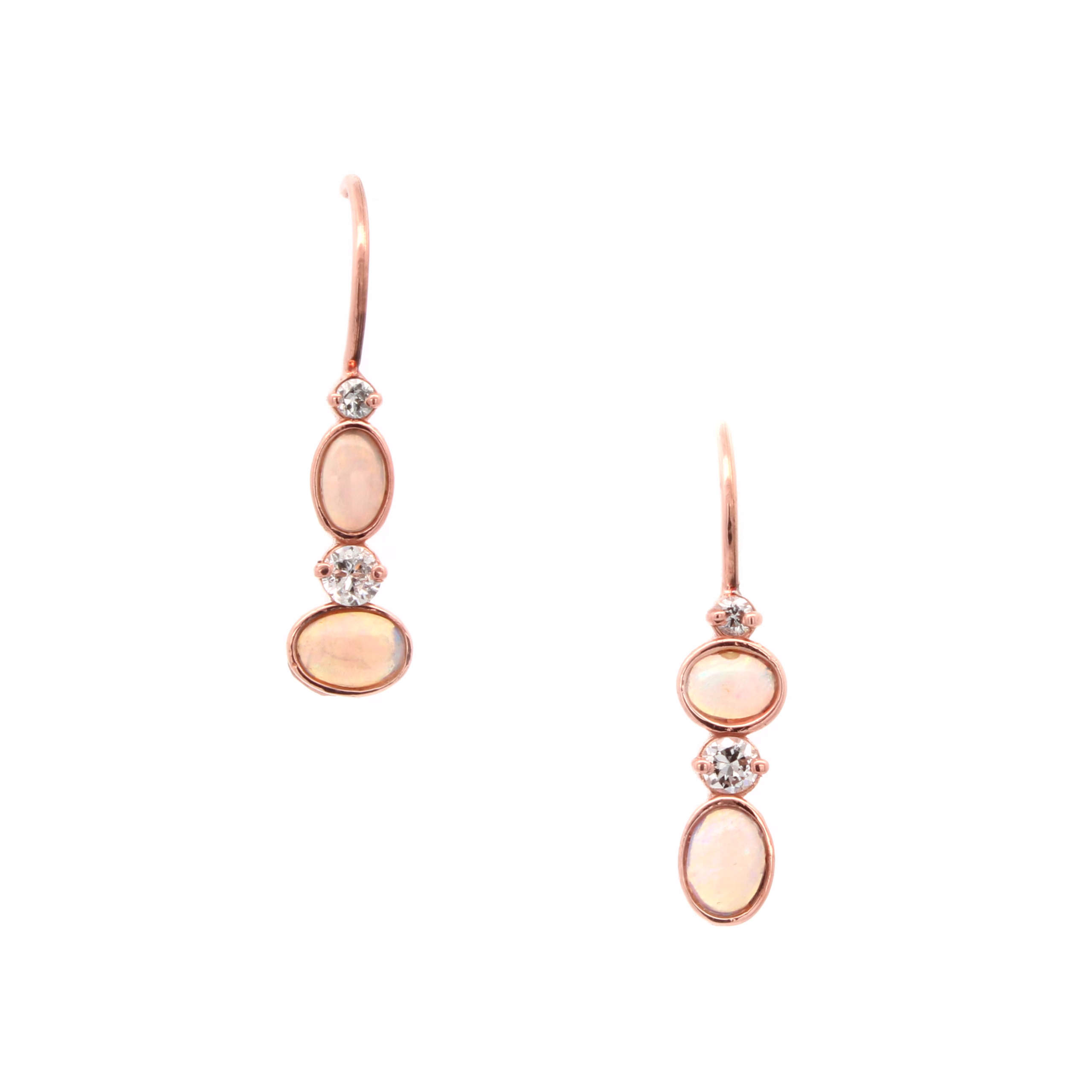 These asymmetrical earrings feature white opals and round white diamonds. They are made of 14k rose gold and measure 3/4″ in length.